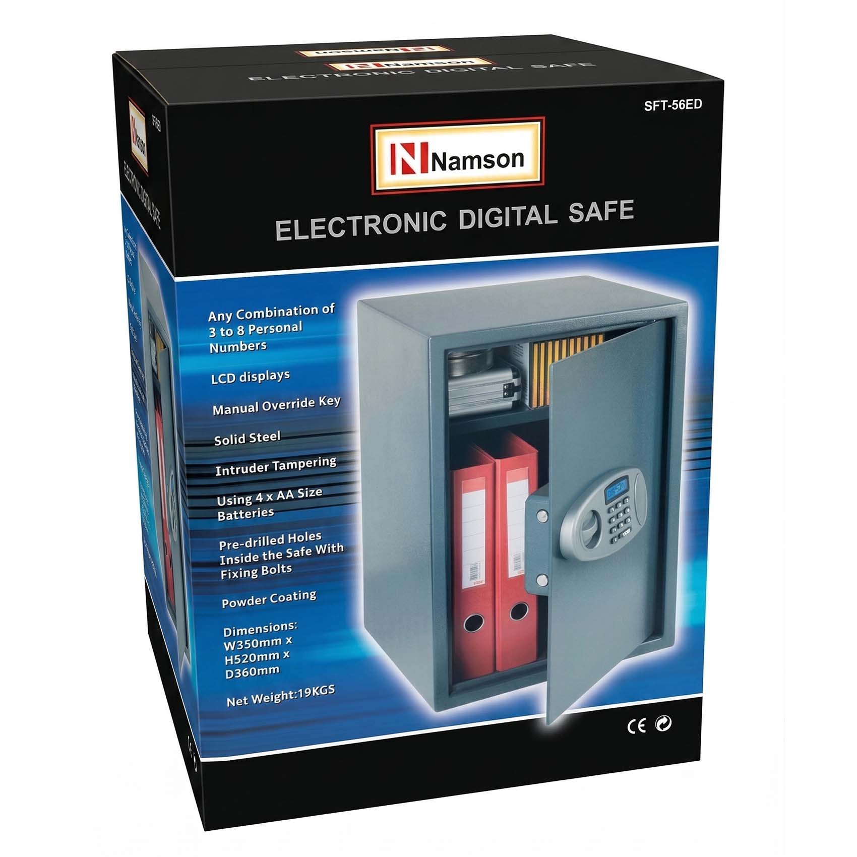 Namson Electronic Digital Safe Box SFT-56EDN – Advanced LCD Security Safe Spacious steel safe with LCD display, digital keypad, and emergency key access. Ideal for securing valuables, documents, and electronics at home or office.