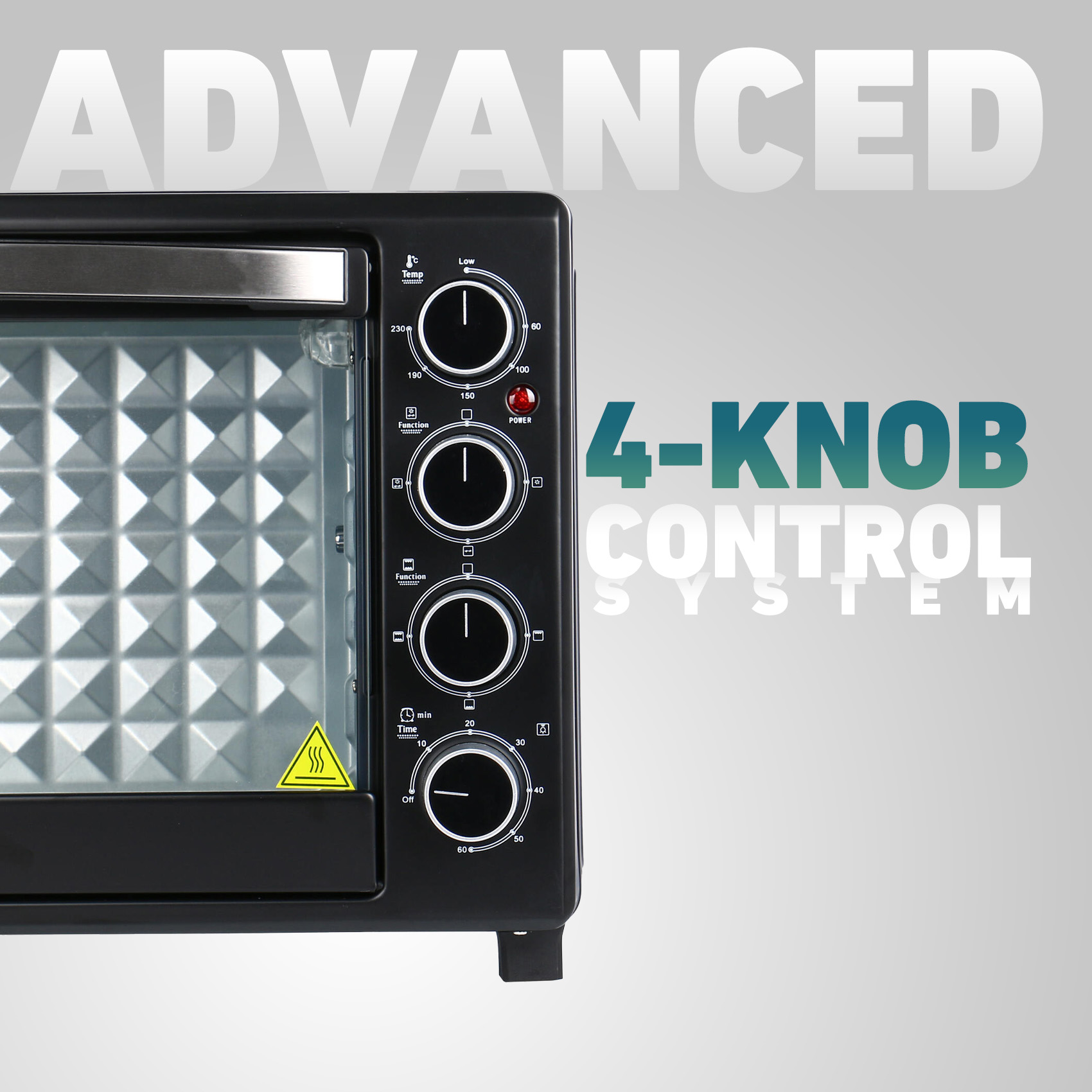 The oven features a 4-knob control panel for complete cooking flexibility: