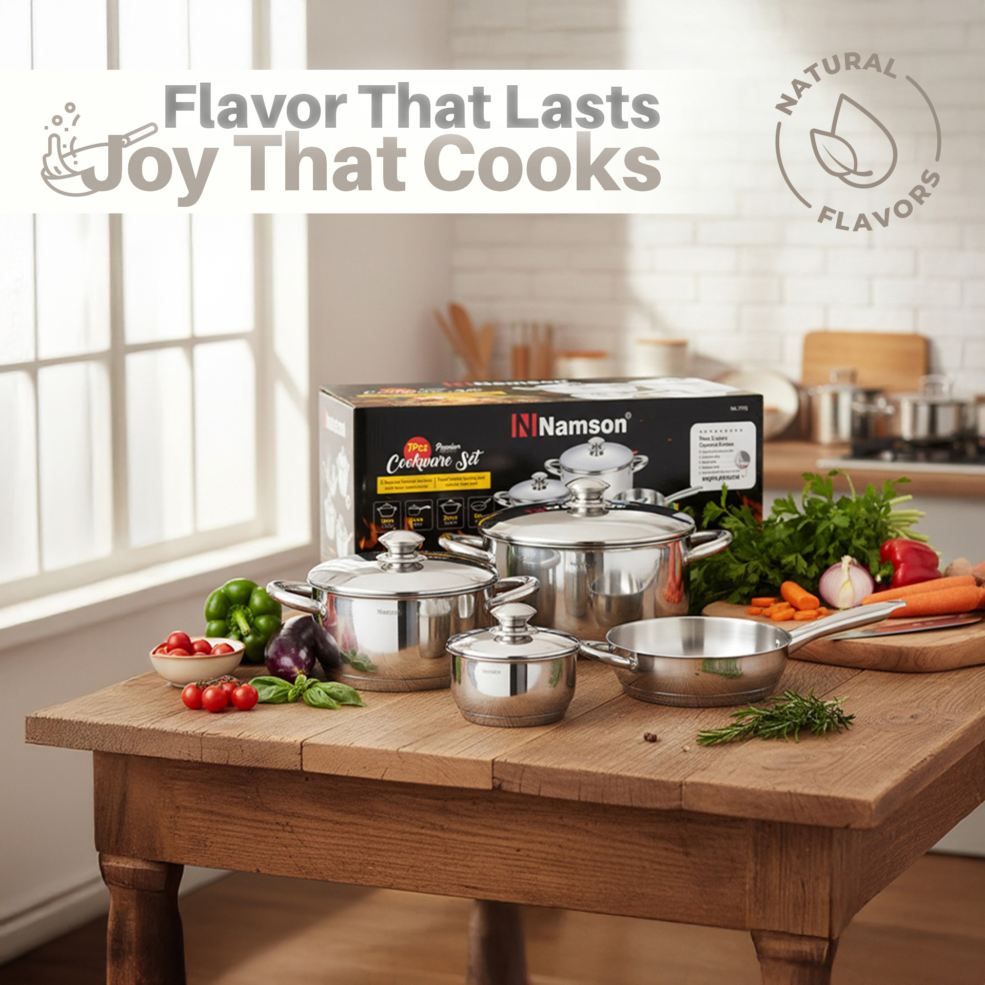 The NAMSON Premium Quality Cookware Set is a versatile, durable, and high-performance cooking solution designed to elevate your everyday culinary experience. Crafted from high-quality stainless steel, this cookware set delivers excellent heat conduction, long-lasting durability, and elegant design, making it ideal for modern kitchens.