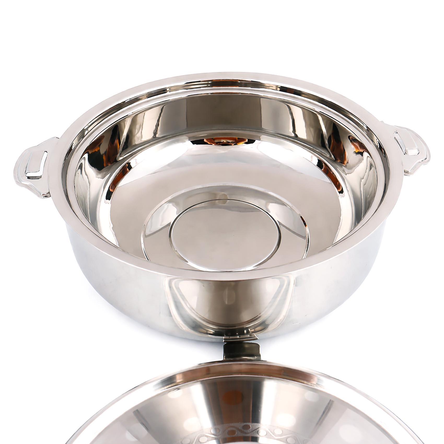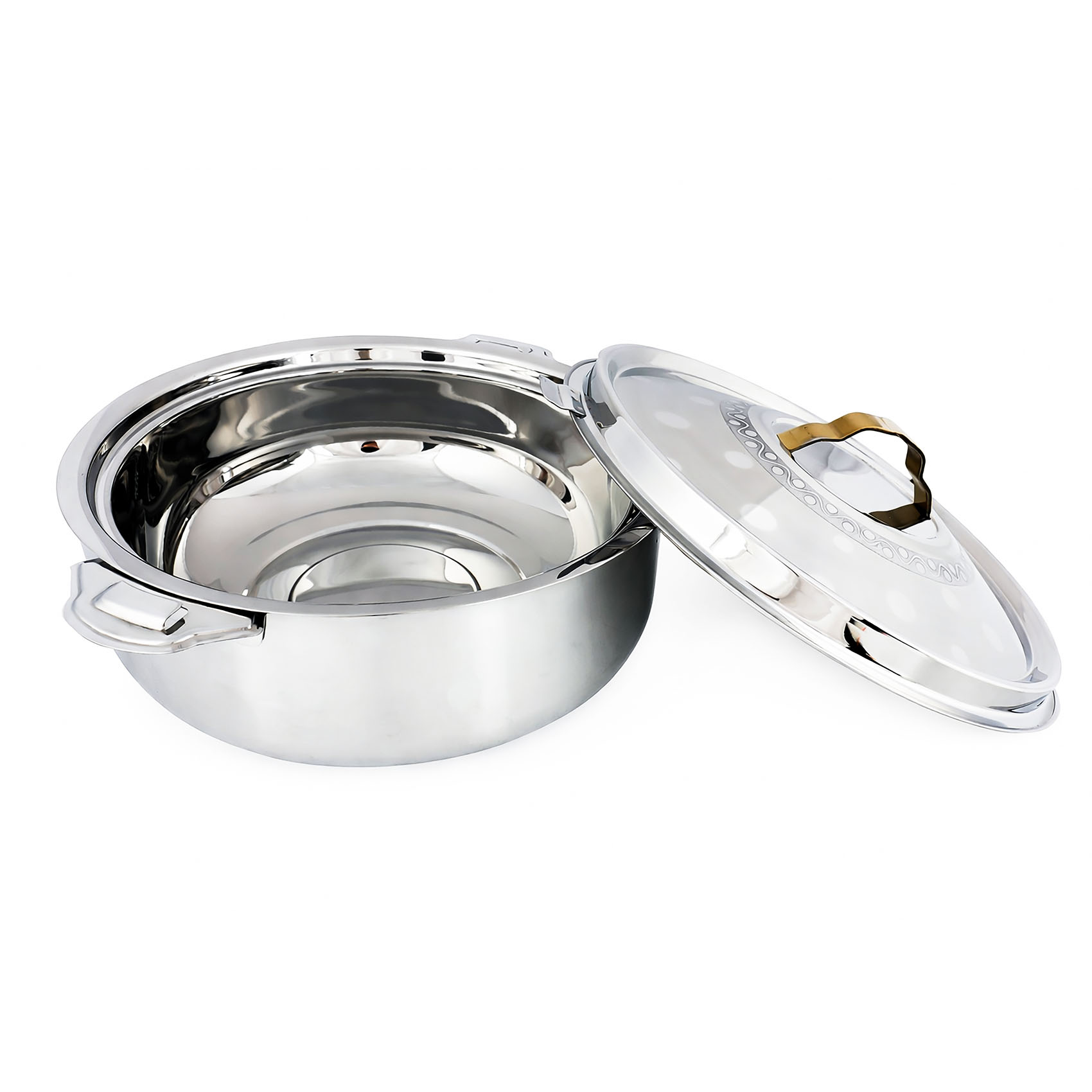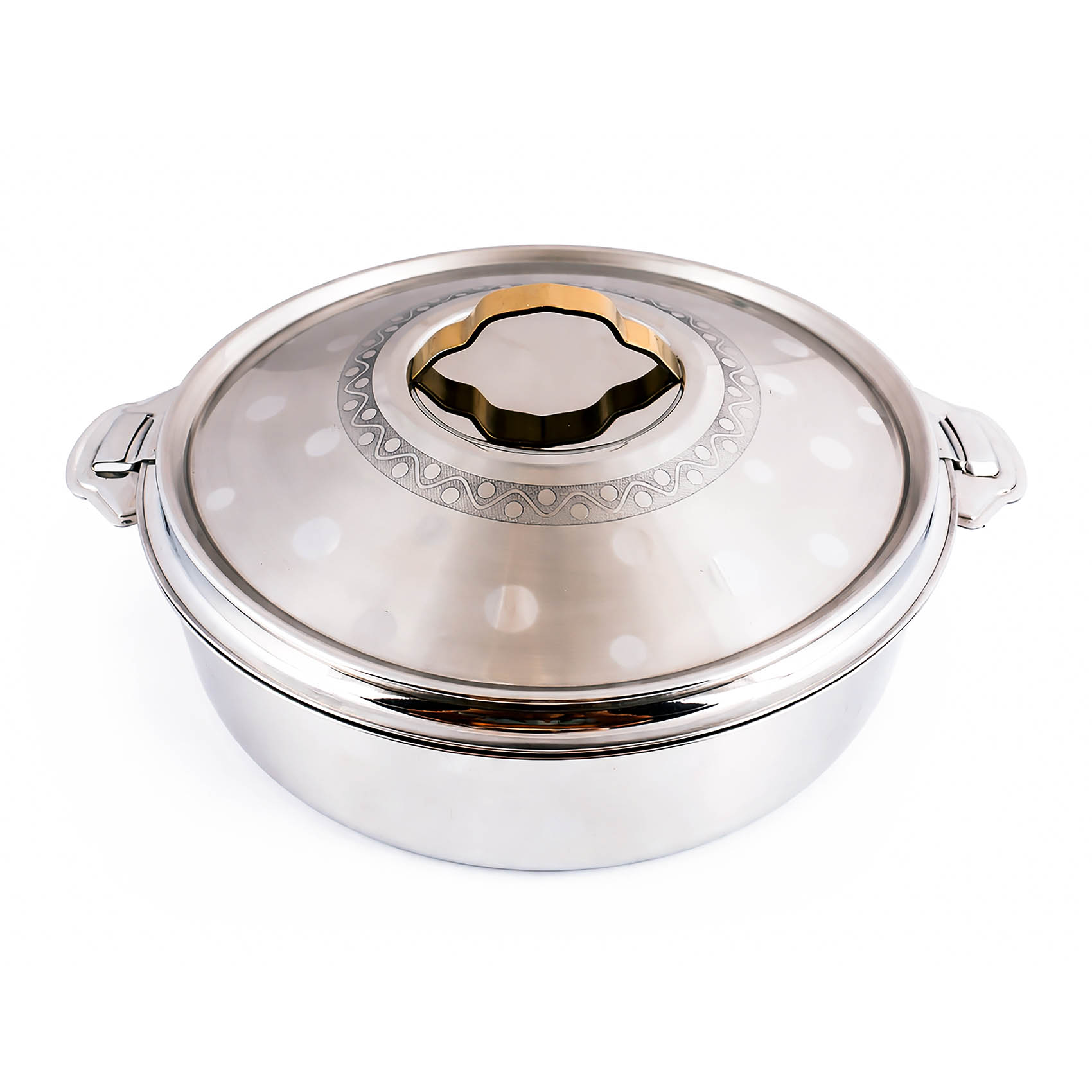 Modern polished stainless steel body with decorative pattern, perfect for home, parties, and serving.