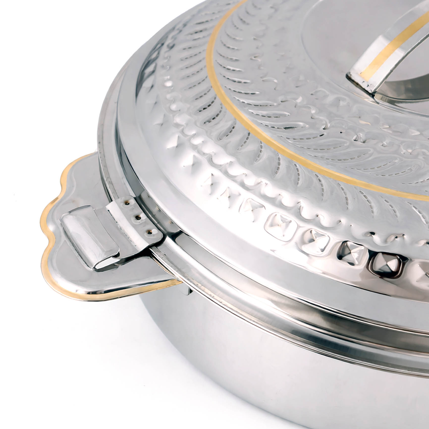 Modern, polished stainless steel body with a decorative pattern, perfect for the home, parties, and serving.