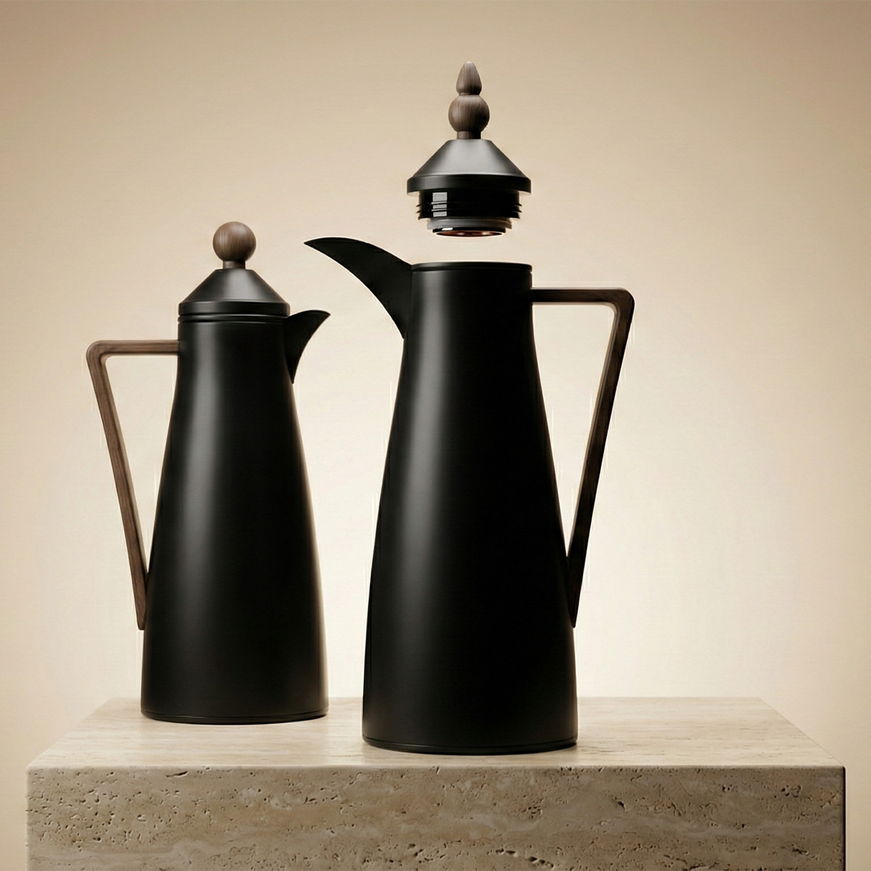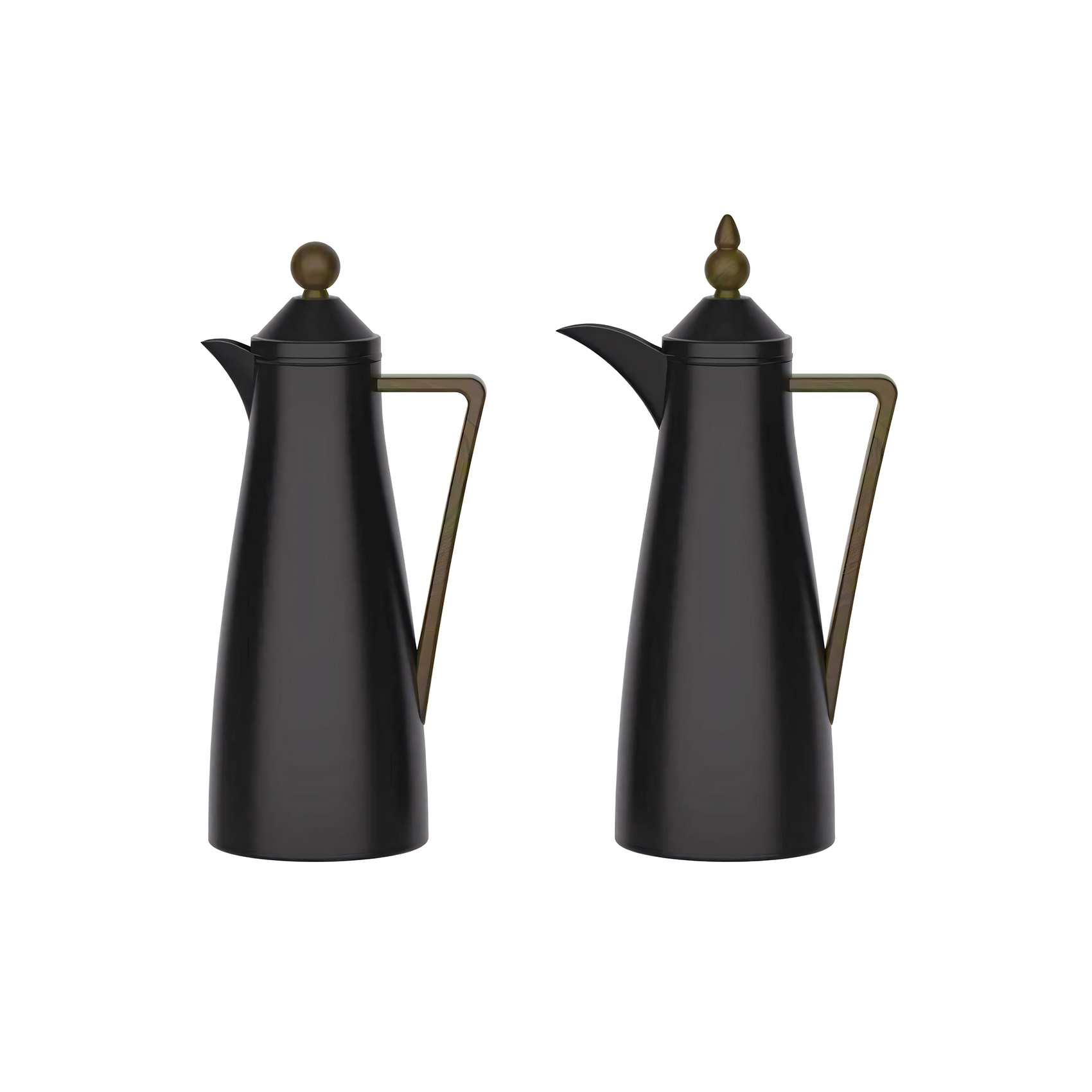 Vacuum Flask Set 2 Pieces black spray paint handle and button in dark wood grain - Stainless steel inner and outer. ABS cap, mouth and handle, Silicone ring pink glass liner asbestos free It's approximately 880g/PC , Premium Thermal Flask for Arabic Coffee & Tea